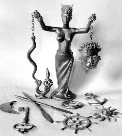 Castings of Olokun's consort, Yemoja Awoyo, his wife, Mami Wata, in her guise as mermaid, and ritual emblems.